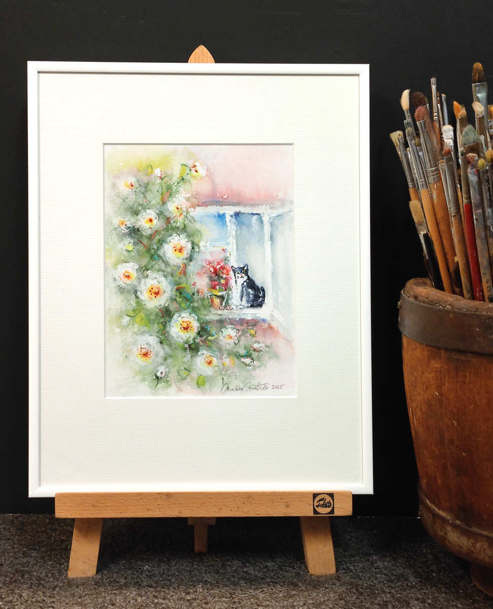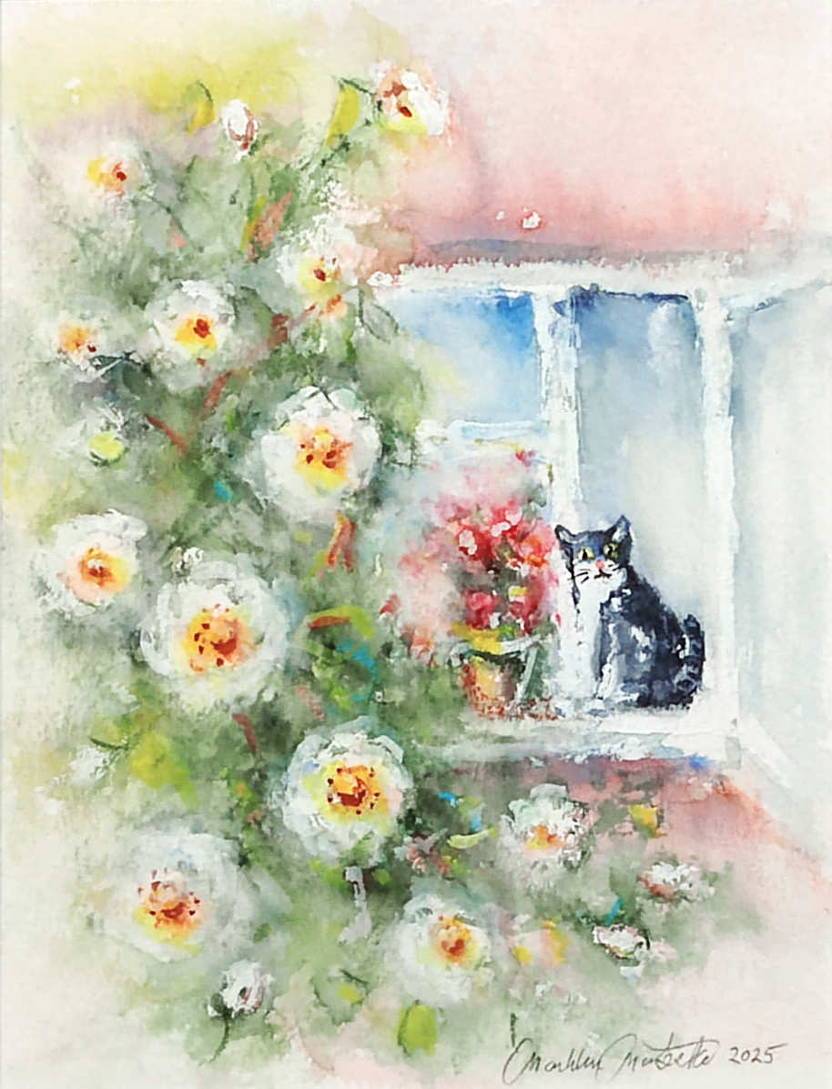 Keskellä kirkasta kesäpäivää, kun ilma tuoksuu juhannusruusulta ja tuuli kantaa pelargonian hennon aromin ikkunasta ulos, musta kissa istuu hiljaa tuvan ikkunalla. Sen silmät tarkkailevat maailmaa kuin se tietäisi enemmän kuin kertoo. Kissan vieressä pelargonia loistaa punaisena kuin pieni sydän kesän keskellä, ja ulkopuolella juhannusruusu kukkii yltäkylläisenä, kuin sekin haluaisi osallistua tuvan hiljaiseen juhlaan.