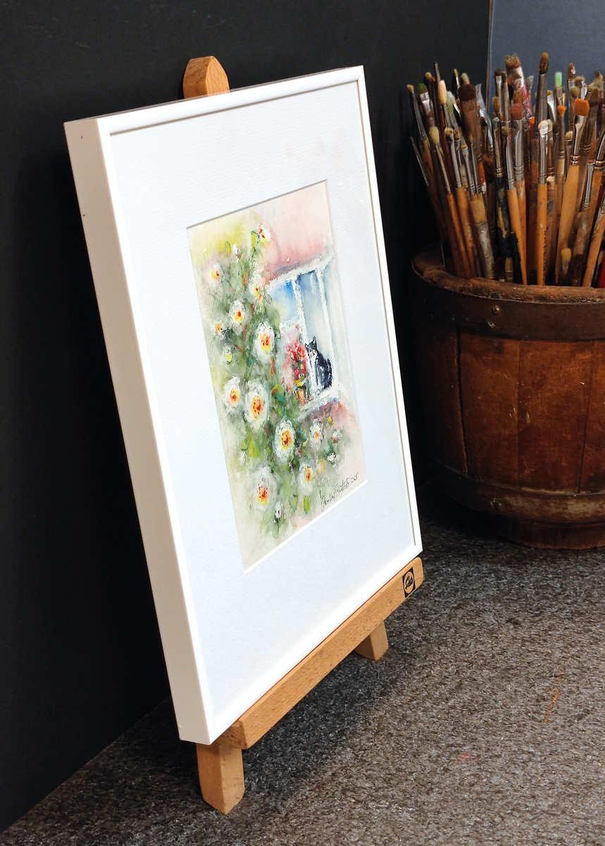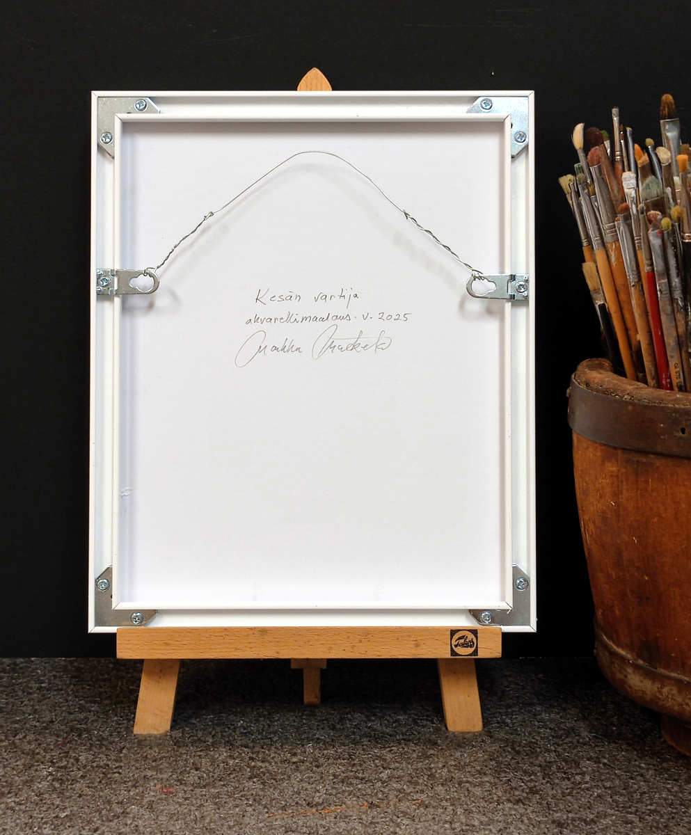 Akvarellimaalaus, maalattu 300 gr vahvalle akvarellipaperille. Kehystetty happovapailla materiaaleilla, jotka säilyttävät työn hyvänä vuosikymmenestä toiseen. Kehyksenä valkoinen alumiinilista, päällä kirkas taidelasi, joka toistaa värit luonnollisina. Teoksen päälle tulevan lasin reunat on hiottu ennen kehystystä, näin sen kestävyys moninkertaistuu. Teos on ripustusvalmis.