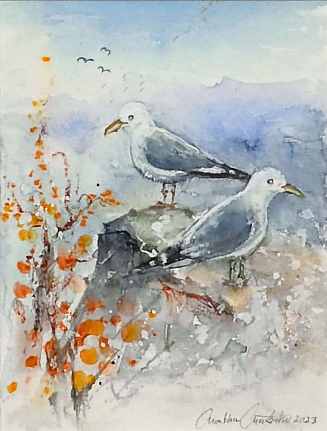 Kaksi lokkia seisoo vaiti kallioisella rannalla, kuin vartijat kesän ja syksyn rajalla. Tyrninoksa, täynnä oransseja marjoja, kurkottaa tuulessa – muistuttaen menneistä lämpimistä päivistä ja tulevasta rauhasta. Taustalla meri hengittää hiljaa, sen pinta pehmeä ja lempeä, kuin olisi sekin pysähtynyt hetkeksi katsomaan.