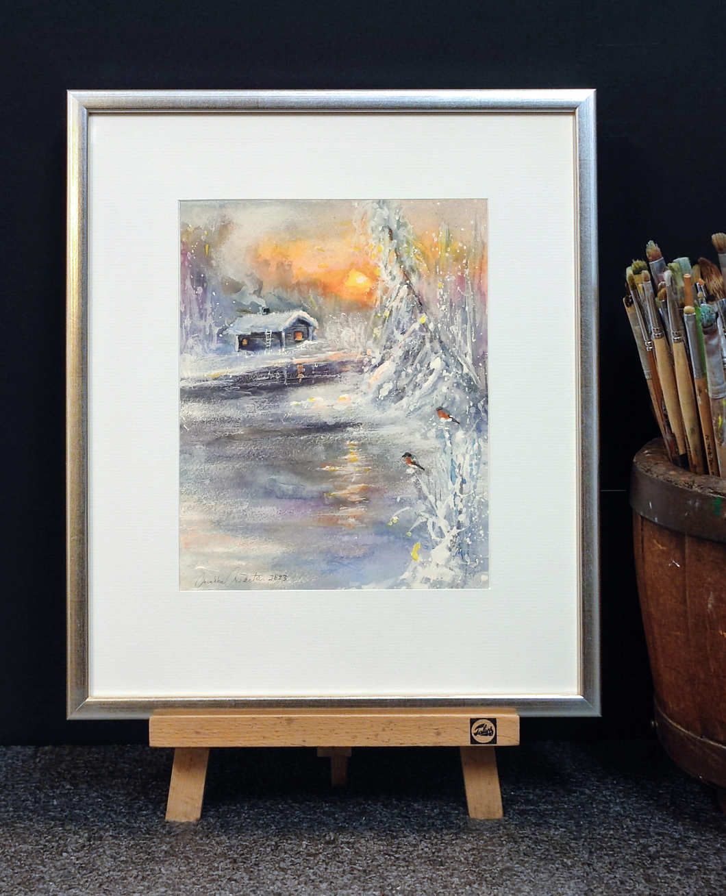 Maalattu 300 gr vahvalle akvarellipaperille. Kehystetty happovapailla materiaaleilla, jotka säilyttävät työn hyvänä vuosikymmenestä toiseen. Kehyksenä 13 mm leveä hopeinen puulista, päällä kirkas taidelasi, joka toistaa värit luonnollisina. Teoksen päälle tulevan lasin reunat on hiottu ennen kehystystä, näin sen kestävyys moninkertaistuu. Teos on ripustusvalmis.