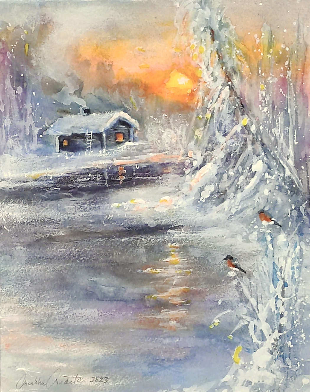 Talvinen aurinko laskee, pakkanen kiristyy, joki alkaa jäätymään ja vastarannalla lämpiää rantasauna. Punatulkut etsivät uteliaina ja toiveikkaina, onko joku asettanut pihalle kauralyhteitä juuri heitä varten. Net hypähtelevät oksalta toiselle, eloisina ja kauniina, tuoden eloa muuten niin hiljaiseen ja seesteiseen talvimaisemaan.