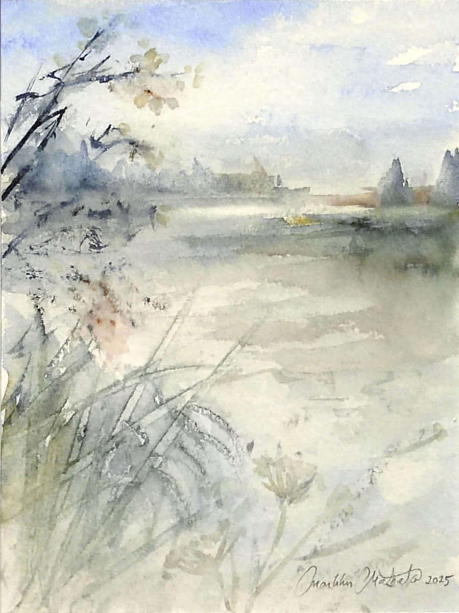 On varhainen heinäkuun aamu. Aurinko vasta harkitsee nousuaan, ja joenvarsi verhoutuu utuun kuin hiljaisuuden viitta. Maiseman ääriviivat liukenevat pehmeään usvaan, ja jokainen kasvi, kivi ja pensaikko hengittää vielä yön rauhaa.