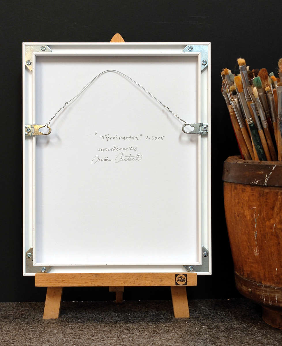 Akvarellimaalaus, maalattu 300 gr vahvalle akvarellipaperille. Kehystetty happovapailla materiaaleilla, jotka säilyttävät työn hyvänä vuosikymmenestä toiseen. Kehyksenä valkoinen alumiinilista, päällä kirkas taidelasi, joka toistaa värit luonnollisina. Teoksen päälle tulevan lasin reunat on hiottu ennen kehystystä, näin sen kestävyys moninkertaistuu. Teos on ripustusvalmis.