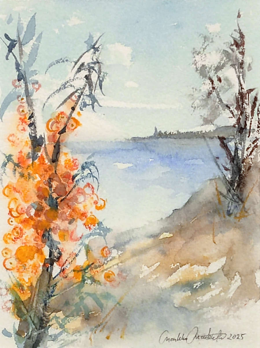 Tyrni inspiroi myös taiteilijaa. Sen marjojen hehku tuo maalaukseen lämpöä ja eloa – väri, joka ei ole vain visuaalinen, vaan lähes tunne: pirskahteleva energia, joka saa katsojan hymyilemään.