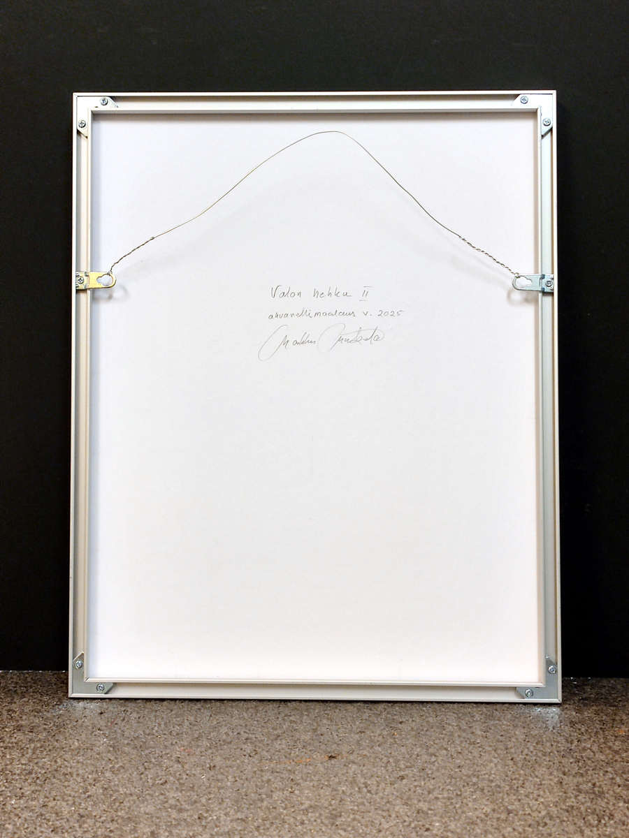 Teos on maalattu 300 g:n vahvalle akvarellipaperille, joka takaa värien syvyyden ja kestävyyden. Akvarellimaalauksessa käytetty hieman valkoista guassi vesiväriä. Kehystys on tehty huolellisesti happovapailla materiaaleilla, jotka suojaavat teosta ja säilyttävät sen laadun vuosikymmeniksi.