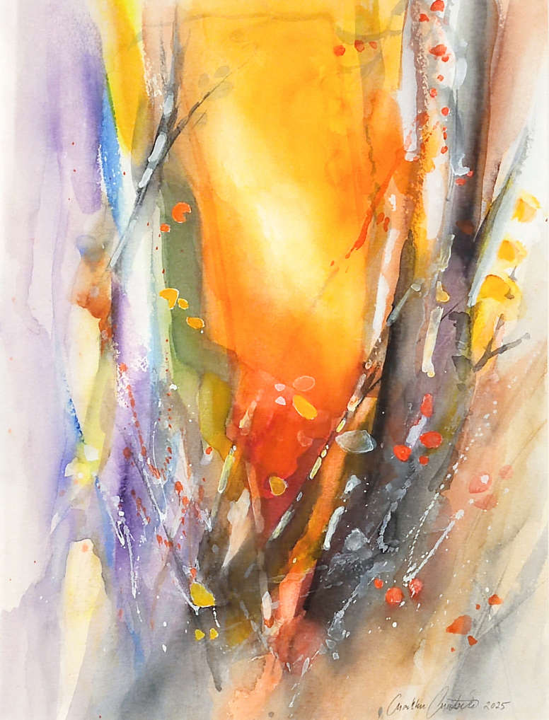 Valo ei aina tule taivaalta – joskus se kumpuaa väreistä, muodoista, hetkistä. Tässä maisemassa aurinko ei vain paista, se tanssii. Keltaisen, oranssin ja punaisen sävyt leiskuvat puunrunkojen lomasta kuin ilon purkaus. Pihlajan marjat loistavat kuin pienet sydämet, muistuttaen että syksykin voi olla täynnä elämää. Tämä ei ole maisema, tämä on tunne – lämmin, rohkaiseva, kuin luonnon oma hymy.
