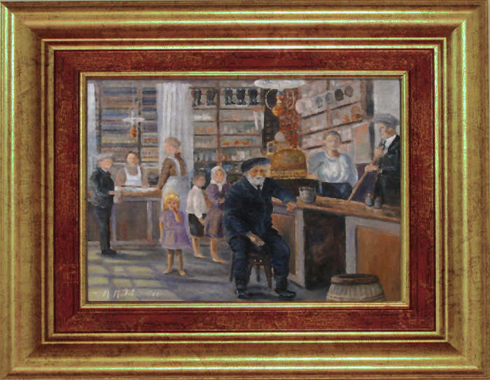 ”Vanhanajan tunnelmaa kyläkaupassa ” Numeroitu vedossarja kankaalle, taulun koko 20 x 24,3 cm